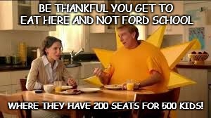 HIGHLANDS MORNING PRAYER | BE THANKFUL YOU GET TO EAT HERE AND NOT FORD SCHOOL WHERE THEY HAVE 200 SEATS FOR 500 KIDS! | image tagged in that's not breakfast,crowd rush,children | made w/ Imgflip meme maker