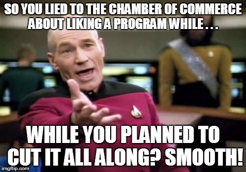 DECEPTION IN THE SPRING AIR! | SO YOU LIED TO THE CHAMBER OF COMMERCE ABOUT LIKING A PROGRAM WHILE . . . WHILE YOU PLANNED TO CUT IT ALL ALONG? SMOOTH! | image tagged in memes,picard wtf,science,curriculum | made w/ Imgflip meme maker
